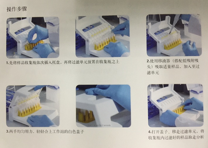 Claristep®***多可同时处理8个样品,且不需要任何电源或真空/压力源。用于单次过滤Claristep®过滤单元配有RC膜,适用样品体积范围是60 μL-600 μL,保留体积小于30 μL。经过优化的过滤单元既可以过滤有机溶剂,也可以过滤水溶液,具有广泛的化学兼容性,与此同时对分析样品成分的非特异性吸附极低。样品与滤器和盖子的接触时间极短,进而确保获得理想的无污染物干扰的分析结果。滤出液可被收集到任何外径尺寸为12 × 32 mm 的样品瓶中,用户可根据样品性质和所采用的分析方法自由选择适当的样品收集瓶。