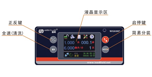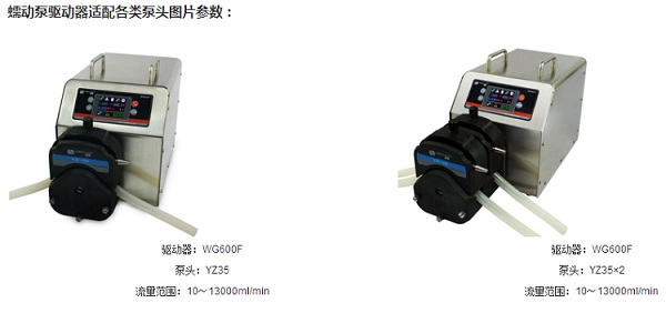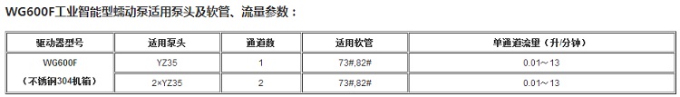 WG600F工业智能型蠕动泵,适于工业场所精准的大流量传输和分装液体。流量范围0.01-13升/分钟;工作转速0.1-600转/分钟;可级联双泵头;无刷伺服电机驱动,免维护,动力更强劲更精准;具有正反,启停,全速(清洗),流量调节等基本功能。具有液量分配,时间分配和复制分配模式,满足各种复杂的分装要求。RS485通讯接口,采用了MODBUS协议,更易于与其他控制设备如计算机,人机界面,PLC等连接。