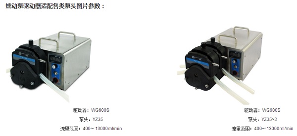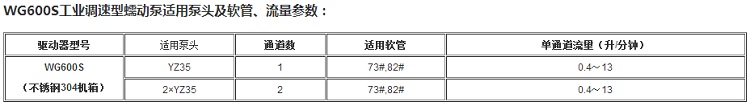 WG600S工业调速型蠕动泵,适于工业场所大流量传输液体。流量范围0.4~13升/分钟;工作转速30-600转/分钟;可级联双泵头;无刷电机驱动,免维护,动力更强劲;具有正反,启停,全速(清洗),调速等基本功能。RS485通讯接口,采用了MODBUS协议,更易于与其他控制设备如计算机,人机界面,PLC等连接。