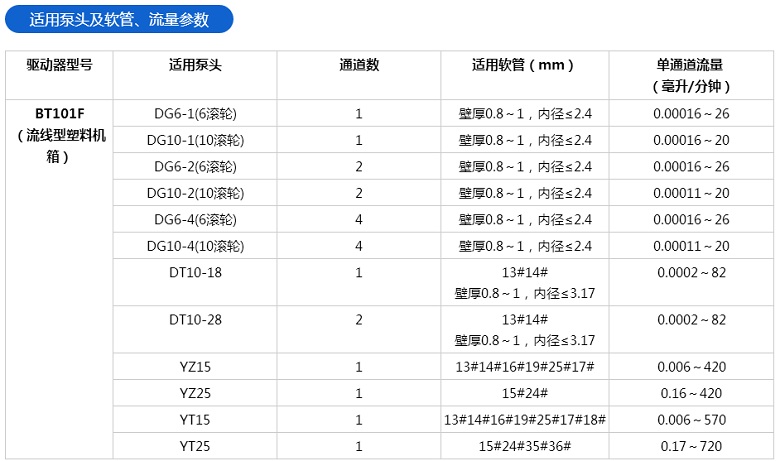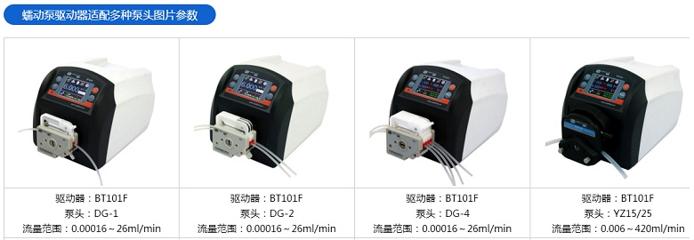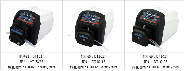 BT101F分配型智能蠕动泵流量范围0.00011~720毫升/分钟。采用彩色液晶和触摸屏技术,操作界面简单,直观,明了。主要适用于各种复杂的液体定量分配,适用于精确计量和定量给料,可以实现高精度的流量传输控制。对液量分装精度要求高时,使用液量分配模式更加方便;对产量要求高时,使用时间分配模式更加方便;需要将一定液体分装为若干份液体时请使用复制分配模式。设置为流量模式时,完全等同于一台流量型蠕动泵。为了减小不必要的风扇噪音,采用了智能温控技术。在RS485通讯中,因为采用了MODBUS协议,更易于与其他控制设备如计算机,人机界面,PLC等连接。