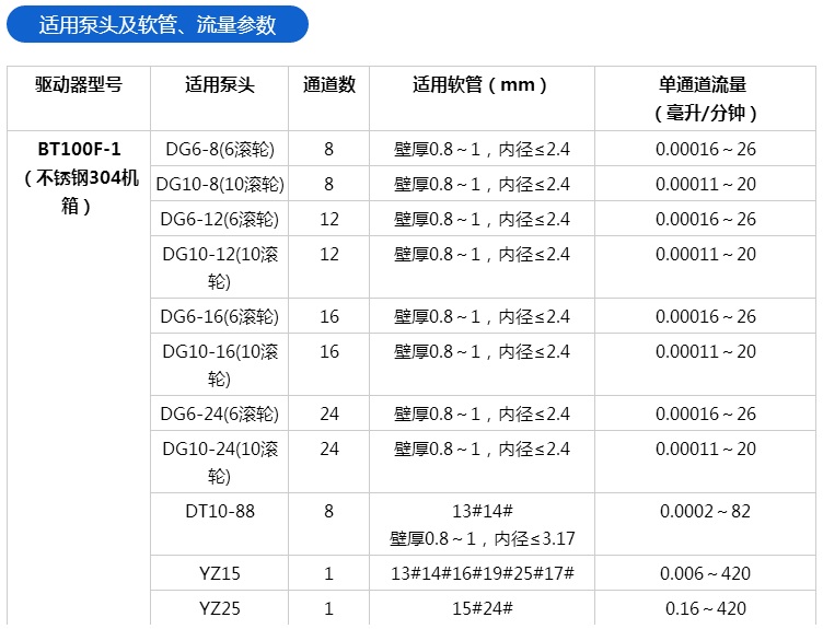 BT100F-1分配智能型蠕动泵采用彩色液晶显示,触摸屏操作,直观便捷;四种工作模式:流量模式,液量分配,时间分配,复制分配,适应不同工作要求;大扭矩输出,可与更多泵头组合使用;标准通讯协议,控制更方便;智能温控风扇,减少噪音;不锈钢外壳,易清洗,耐腐蚀。