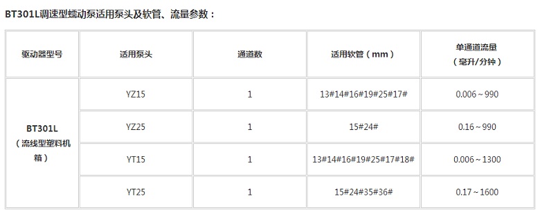 BT301L流量型智能蠕动泵流量范围0.006~1600毫升/分钟。采用彩色液晶和触摸屏技术,操作界面简单,直观,明了。主要适用于精准流量传输控制,用户可以根据自己的需要流量显示,流量控制,流量累计。同时本产品实现了重复定时定量传输。适用于精确计量和定量给料,精度最高可达0.5%,为了减小不必要的蠕动泵噪音,采用了智能温控技术。在RS485通讯中,因为采用了MODBUS协议,更易于与其他控制设备如计算机,人机界面,PLC等连接。