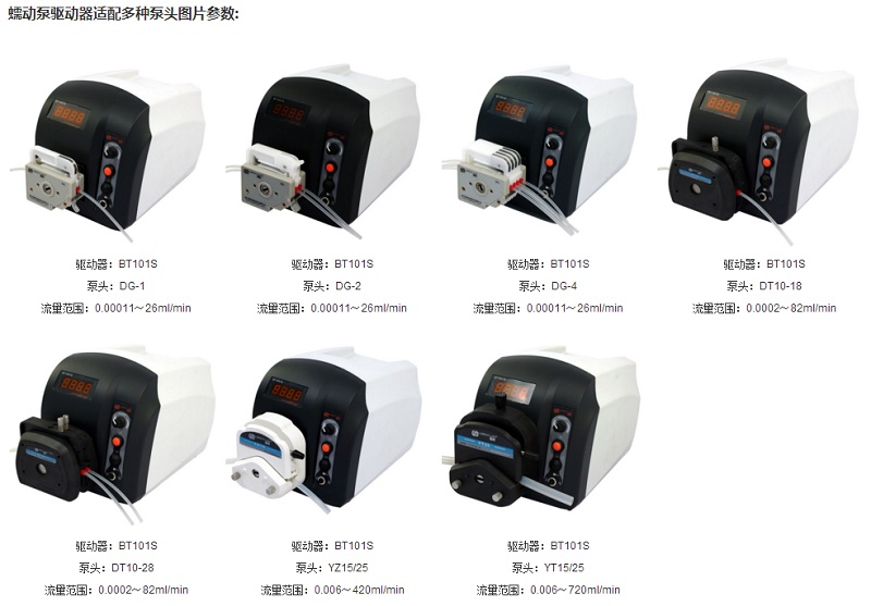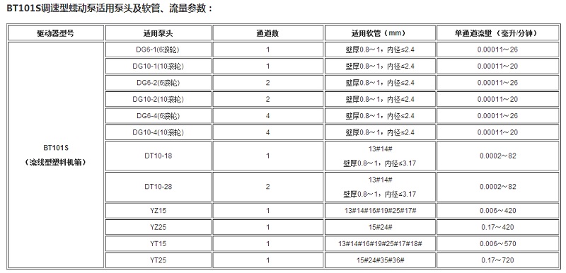 BT101S调速型蠕动泵流量范围0.00011~720毫升/分钟;工作转速0.1-150转/分钟;具有正反,启停,全速(清洗),调速等基本功能外,另外还可通过“简易分装键”实现定时定量输送液体的功能。在RS485通讯中,因为采用了MODBUS协议,更易于与其他控制设备如计算机,人机界面,PLC等连接。