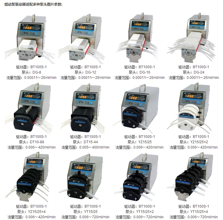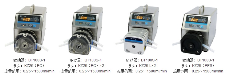 BT100S-1调速型蠕动泵流量范围0.00016~1500毫升/分钟;工作转速0.1-150转/分钟;具有正反,启停,全速(清洗),调速等基本功能外,另外还可通过“简易分装键”实现定时定量输送液体的功能。在RS485通讯中,因为采用了MODBUS协议,更易于与其他控制设备如计算机,人机界面,PLC等连接。