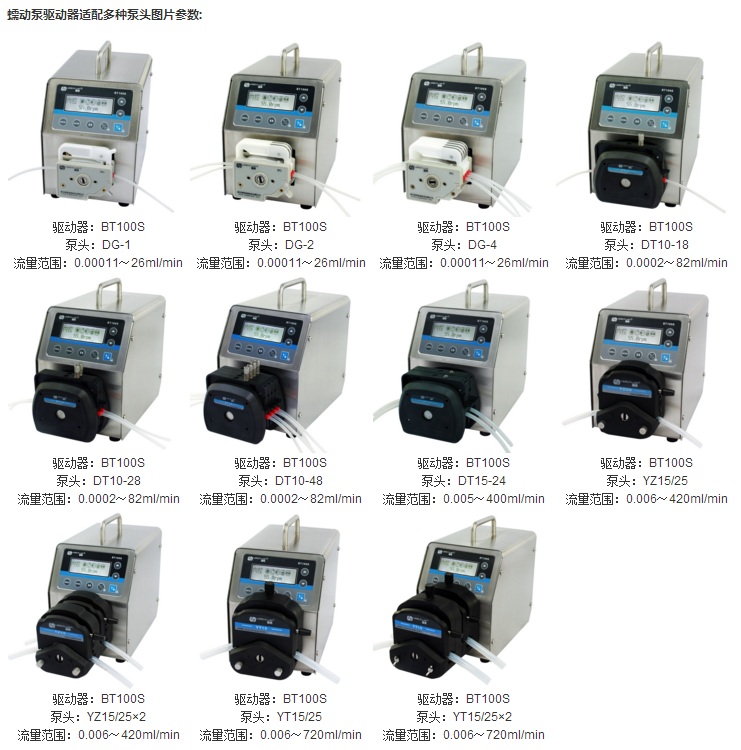 BT100S调速型蠕动泵流量范围0.00011~720毫升/分钟;工作转速0.1-150转/分钟;专用的LF-LCD-OS软件系统,中英文显示,简单方便;具有转速调节,正反,启停,全速(清洗)等基本功能;专用的“简易分装键”,功能强大,可实现定时定量,连续分装,流量测试等功能。