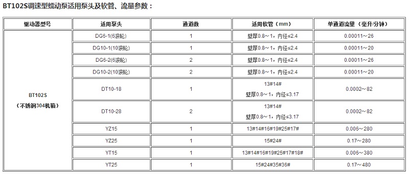 BT102S调速型蠕动泵流量范围0.00011~480毫升/分钟;工作转速0.1-100转/分钟;具有正反,启停,全速(清洗),调速等基本功能外,另外还可通过“简易分装键”实现重复定量输送液体的功能。在RS485通讯中,因为采用了MODBUS协议,更易于与其他控制设备如计算机,人机界面,PLC等连接。