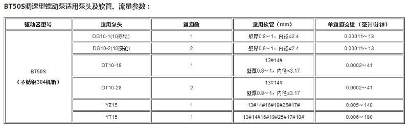 BT50S调速型蠕动泵流量范围0.00011~190毫升/分钟;工作转速0.1-50转/分钟;具有正反,启停,全速(清洗),调速等基本功能外,另外还可通过“简易分装键”实现重复定量输送液体的功能。在RS485通讯中,因为采用了MODBUS协议,更易于与其他控制设备如计算机,人机界面,PLC等连接。