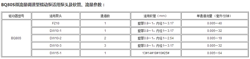 BQ80S微流量调速型蠕动泵,采用嵌入式设计,可与用户其他设备配套使用,也可以单独放置在桌面使用。流量范围0.005 ~64毫升/分钟;工作转速0.1~80转/分钟; 具有正反,启停,全速(清洗),调速等基本功能。泵头内置美国Pharmed® BPT 泵管,软管理论连续工作寿命7500小时。RS485通讯接口,采用了MODBUS协议,更易于与其他控制设备如计 算机,人机界面,PLC等连接。