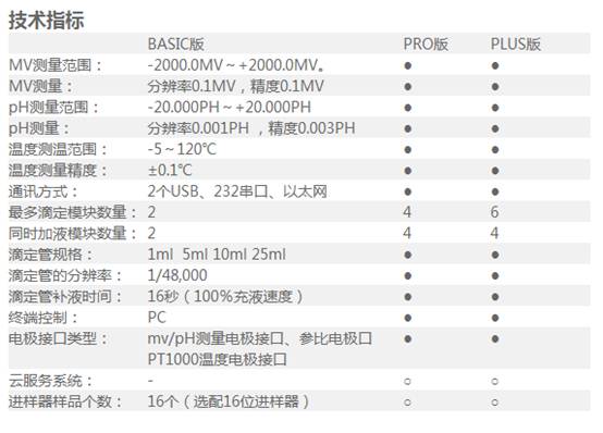 MEAS:测量pH/mV/T、CAL:pH校正、SET设定终点模式、MET等量滴定、MET等量滴定二阶微商法(测氯离子)、DET动态滴定,用量:按预设定的固定量进行滴定,清洗:滴定结束后自动清洗。