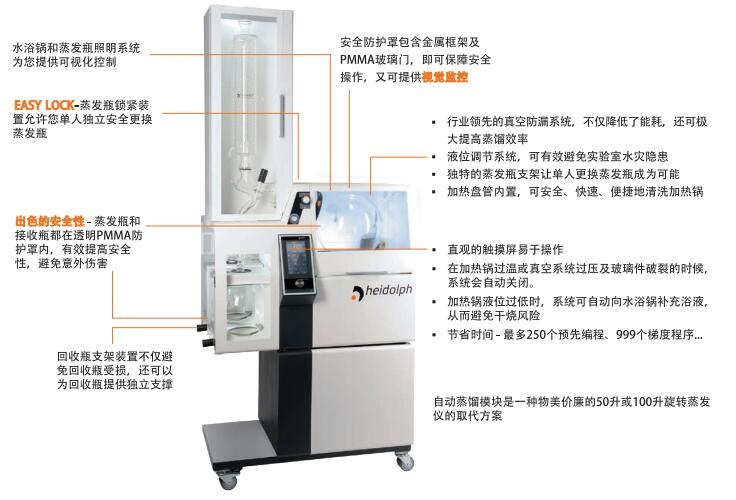 特点:Heidolph Hei-VAP Industrial大型旋转蒸发仪带有背光的大型触摸屏控制面板,可显示所有工艺参数、可设定梯度程序。