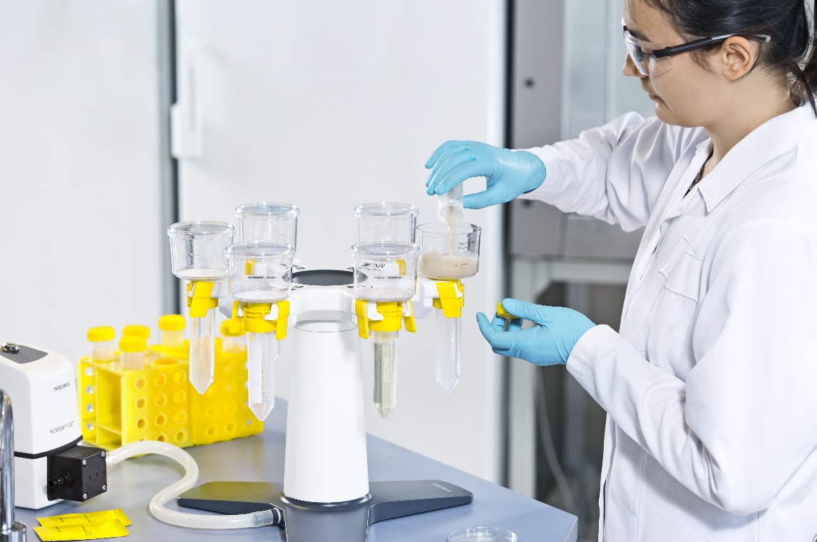 该组合产品操作有两种方式,如果仅有一个样品需要处理,只需要将助滤剂倒入细胞培养液,简单混匀后倒入负压滤器进行真空抽滤即可。如果有多个样品需要处理,可以配合Sartolab® MultiStation使用,首先将负压滤器装载于Sartolab® MultiStation,并与真空泵连接,再将适量助滤剂倒入每个样品中,混匀后分别倒入负压滤器中直接抽滤即可,可快速同时处理多个样品。