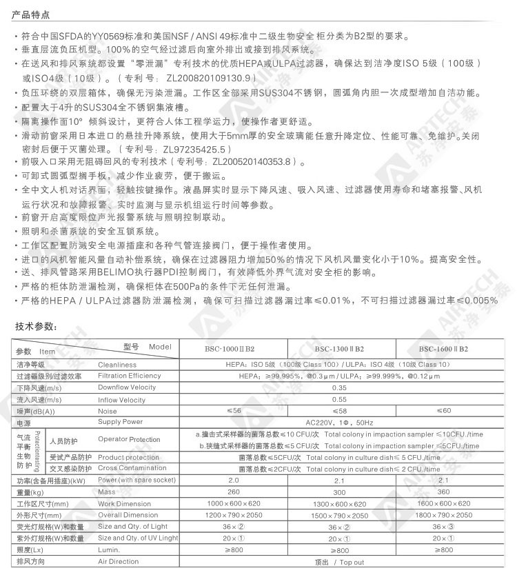 过滤效率:@0.3μm 99.995%。洁净度:ISO 5(100级)