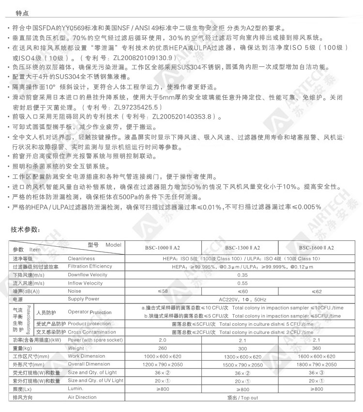 生物安全柜是用于生物安全实验室和其它实验室的生物安全防护隔离设备。可以防止有害悬浮微粒、气溶胶的扩散;对操作人员、样品及样品间交叉感染和环境提供安全保护。 本公司生产的生物安全柜严格按照国家医药行业强制性标准YY0569-2005、美国NSF/ANSI 49-2002和日本JISK3800:2000标准进行设计、制造和各类检测。除采用美国大流量颗粒检测系统对过滤器进行扫描检漏和常规物理性能指标检测外,还专门建造了经国外专家验证合格的国内生物安全柜生产企业中唯一的微生物检测实验室,对生物安全柜进行生物验证测试。检测人员都是经日本有关机构培训的专业人员,能最大程度保证产品质量。 本公司生产的生物安全柜主要有BHC-ⅡA/B3(气流70%循环,30%排放)、BHC-ⅡA2(气流70%循环,30%排放)、BHC-ⅡB2(气流100%排放)等系列。并采用优质高效空气过滤器(HEPA)或超高效空气过滤器(ULPA)供用户选择。 采用优质高效空气过滤器(HEPA)时: 过滤效率:@0.3μm 99.995%。洁净度:ISO 5(100级) 采用超高效空气过滤器(ULPA)时: 过滤效率:@0.12μm 99.999%。洁净度:ISO 4(10级) |