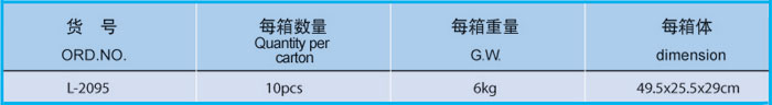 包装说明每箱数量: 10 支每箱毛重: 6.0 kg每箱体积: 49.5 x 25.5 x 29cm