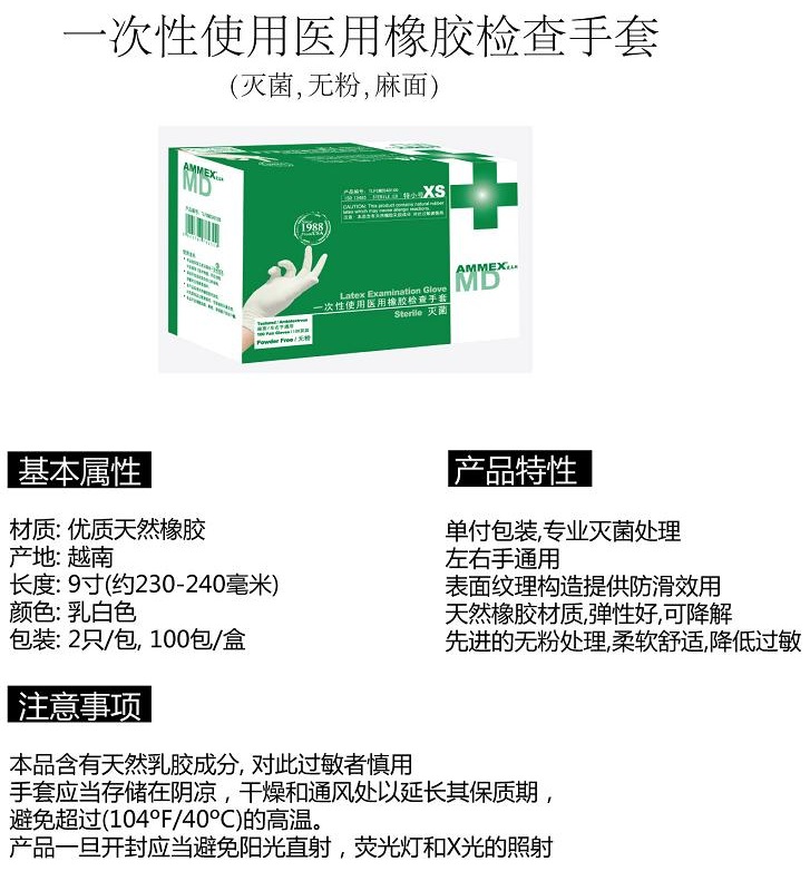 一次性医用橡胶检查手套(灭菌,无粉,麻面),一次性手套,医用手套,灭菌手套