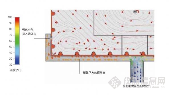 由于输入的新鲜空气引起的温度偏差会影响测试样品的特性或者延长样品烘干时间,因此,对于MEMMERT通用烘箱,新鲜空气先被供给到预热室中预热,然后引入箱体内。 |