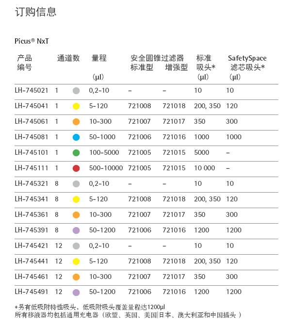 - 单道型号量程覆盖从0.2 µl – 10,000 µl,多道型号量程从0.2 µl – 1,200 µl。