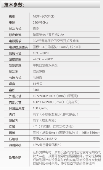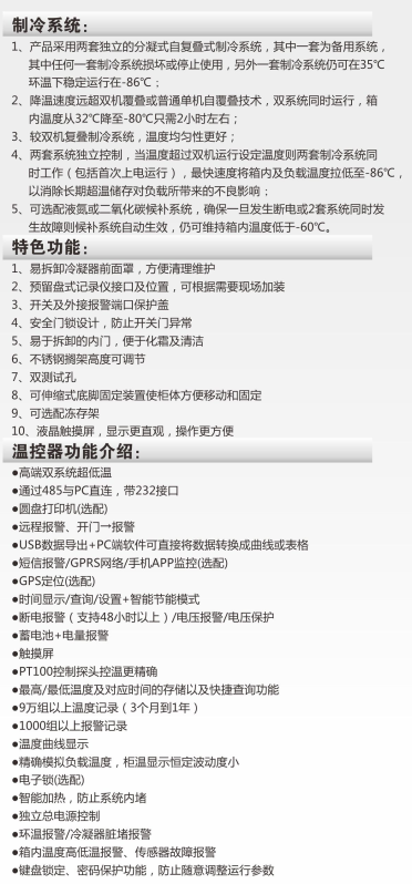 降温速度快箱内温度从32℃降至-80℃只需2小时,冰箱箱内温度最低可达-86℃