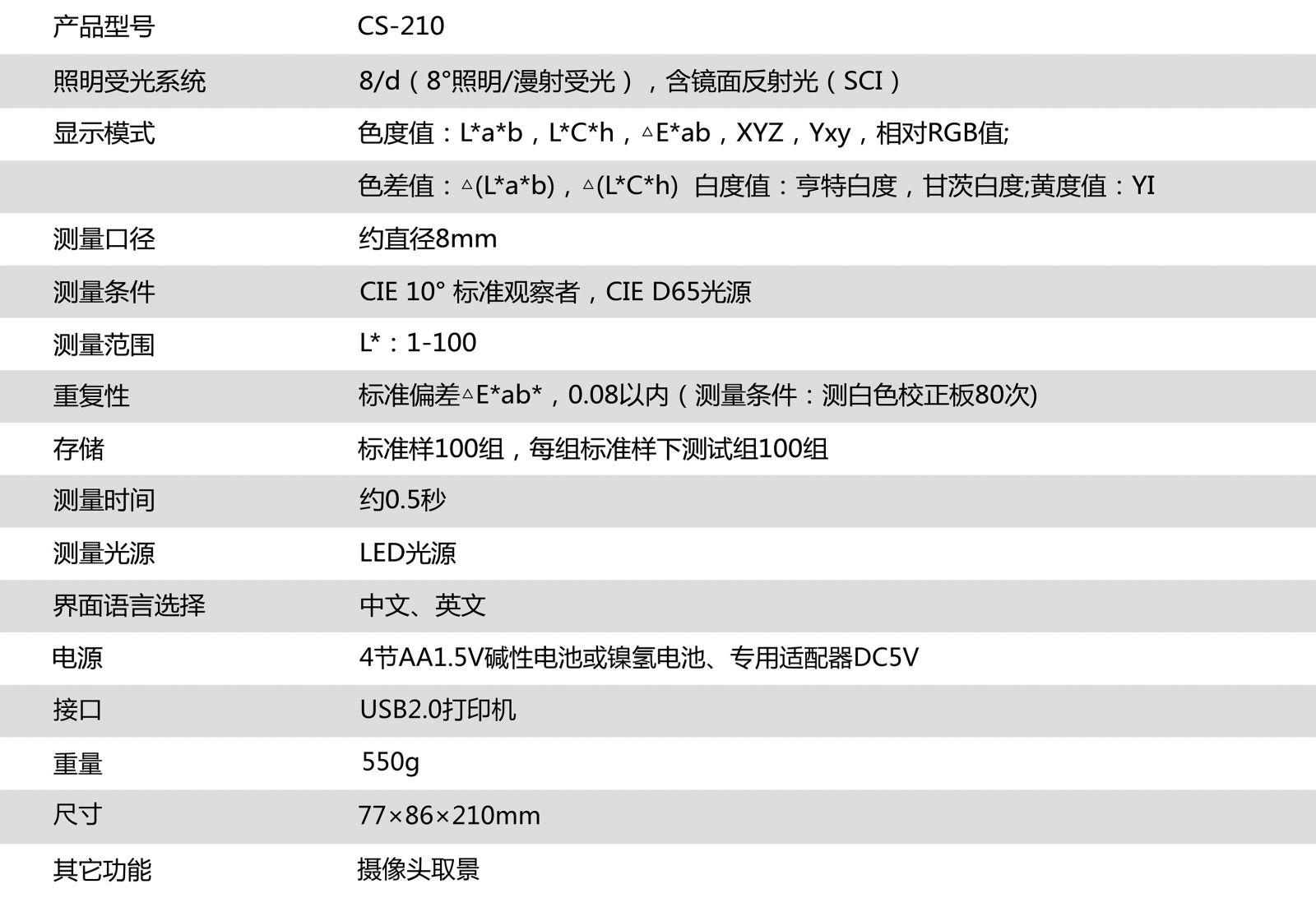 CS-210精密色差仪,广泛应用于塑胶、印刷、油漆油墨、纺织、印染服装等行业的颜色管理领域,根据CIE色空间测量样品色值L*a*b、L*c*h,与被测样品的色差△E以及 △Lab值。