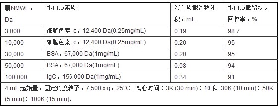 Millipore超滤离心管分为0.5ml、4ml、15ml三种上样体积,并有3kd、10kd、30kd、50kd、100kd五种截留分子量。