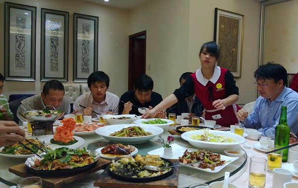 2013年12月12日晚,由赛多利斯南方区经理崔岩先生举办晚宴,右一为崔岩经理;左二为授科仪器的李魁工程师,左三为授科仪器的林俊模工程师 |