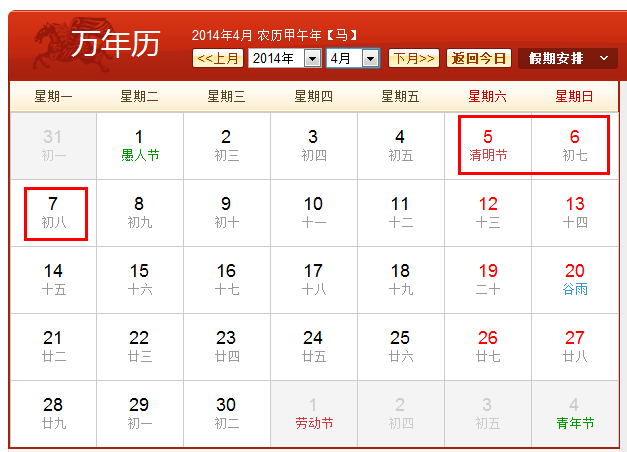 2014年清明节放假安排时间表
