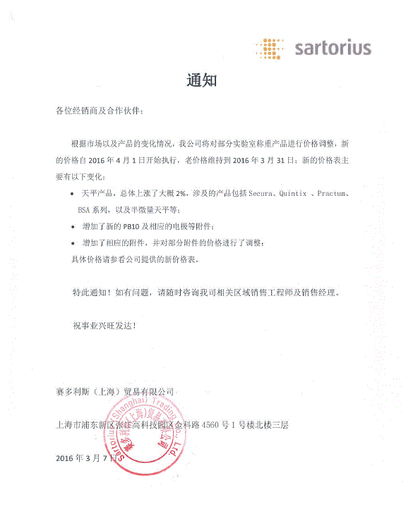 赛多利斯天平涨价通知