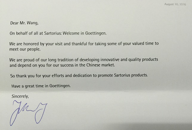 2016年8月10日,应赛多利斯德国哥廷根总部邀请,广州授科代表到达赛多利斯德国总部,受到赛多利斯集团CEO Dr.Joachim Kreuzburg 的热烈欢迎。