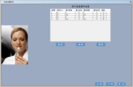 完成分析条件设置后(进样方式选择“手动”)时,,按“下一步”进入“蒸气发生工作程序”窗口,如下图所示: