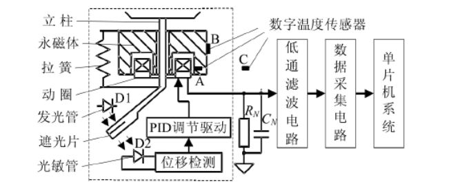 电子天平利用电磁力平衡原理实现称重,工作原理如下图所示。称盘加载前,天平处于初始平衡状态。称盘加载后,天平处于不平衡状态,在被称量物体的重力作用下,遮光片产生向下的位移,使得光敏二极管D2感应到D1发出的光,光信号经光电检测电路转换为电压信号。电压信号通过PID调节,向动圈(可动线圈)提供一个与被称物体的质量m成正比的电流I。动圈在永磁体的磁场作用下,将产生向上的力F,使遮光片向上移动。遮光片向上移动后,光电检测电路的输出电压减少,PID积分环节使流经动圈的电流I继续增大,直至遮光片恢复到初始平衡的位置,实现电磁力自动补偿。