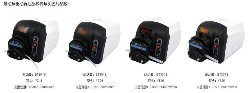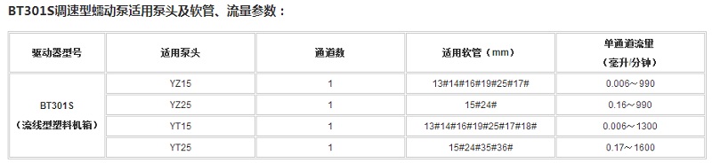 BT301S调速型蠕动泵流量范围0.006~1600毫升/分钟;工作转速0.1-350转/分钟;具有正反,启停,全速(清洗),调速等基本功能外,另外还可通过“简易分装键”实现定时定量输送液体的功能。在RS485通讯中,因为采用了MODBUS协议,更易于与其他控制设备如计算机,人机界面,PLC等连接。